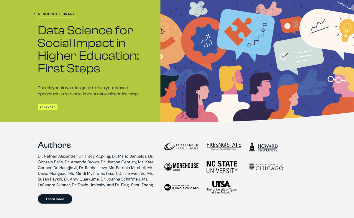 Leaders from the US CAN, which launched in 2022, hosted a webinar to discuss the release of the Data Science for Social Impact in Higher Education Playbook. The playbook is a comprehensive resource to capture best practices and lessons learned from their work to date and help organizations beyond the network to apply findings to their own unique context.