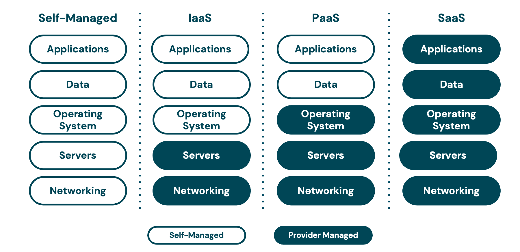 • Self-managed: This model, often associated with the term on-premise or “on-prem”, refers to private data centers that companies maintain themselves, usually within their own spaces. This type of infrastructure can be used to run private clouds, where resources are virtualized similar to those of public clouds.