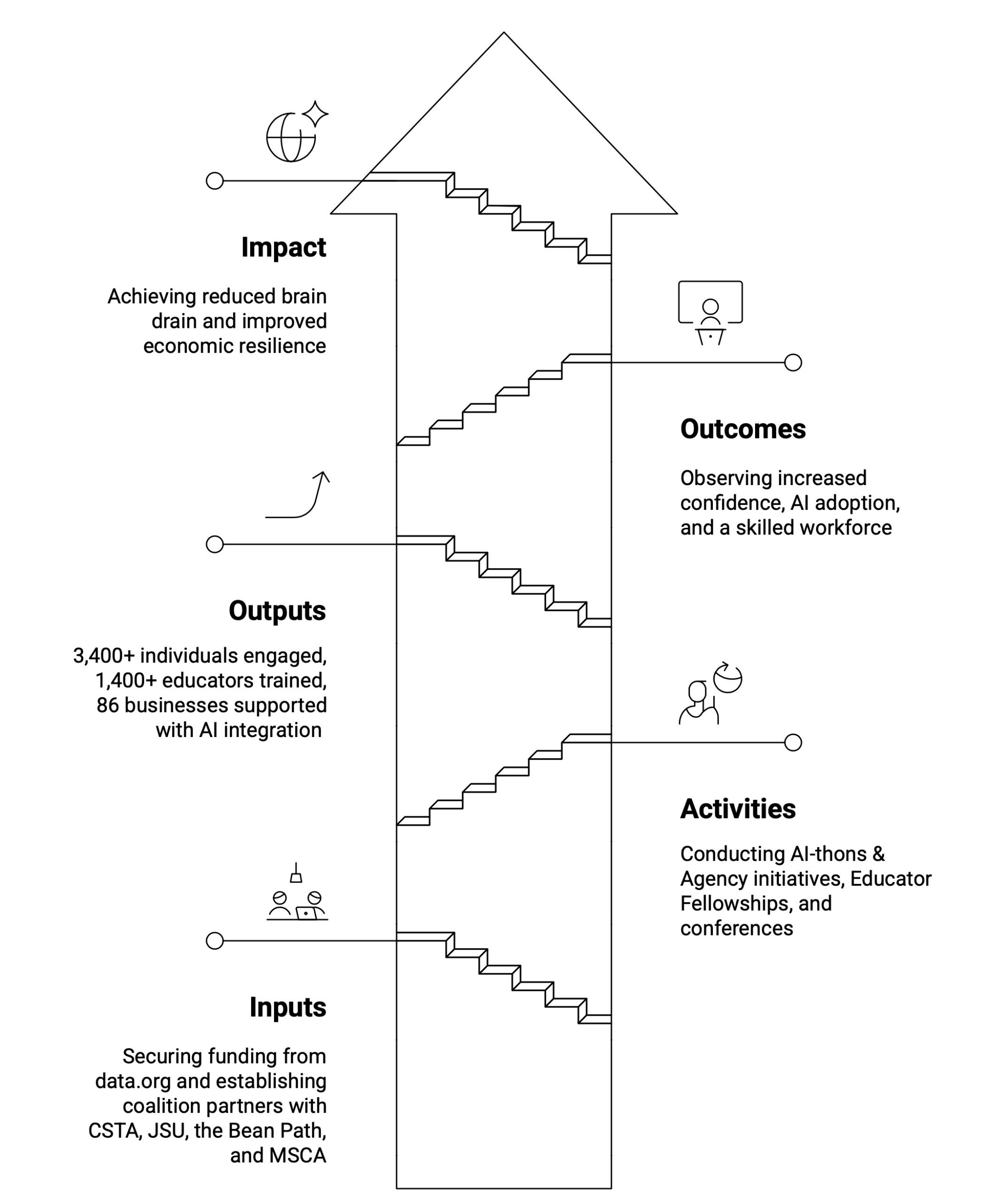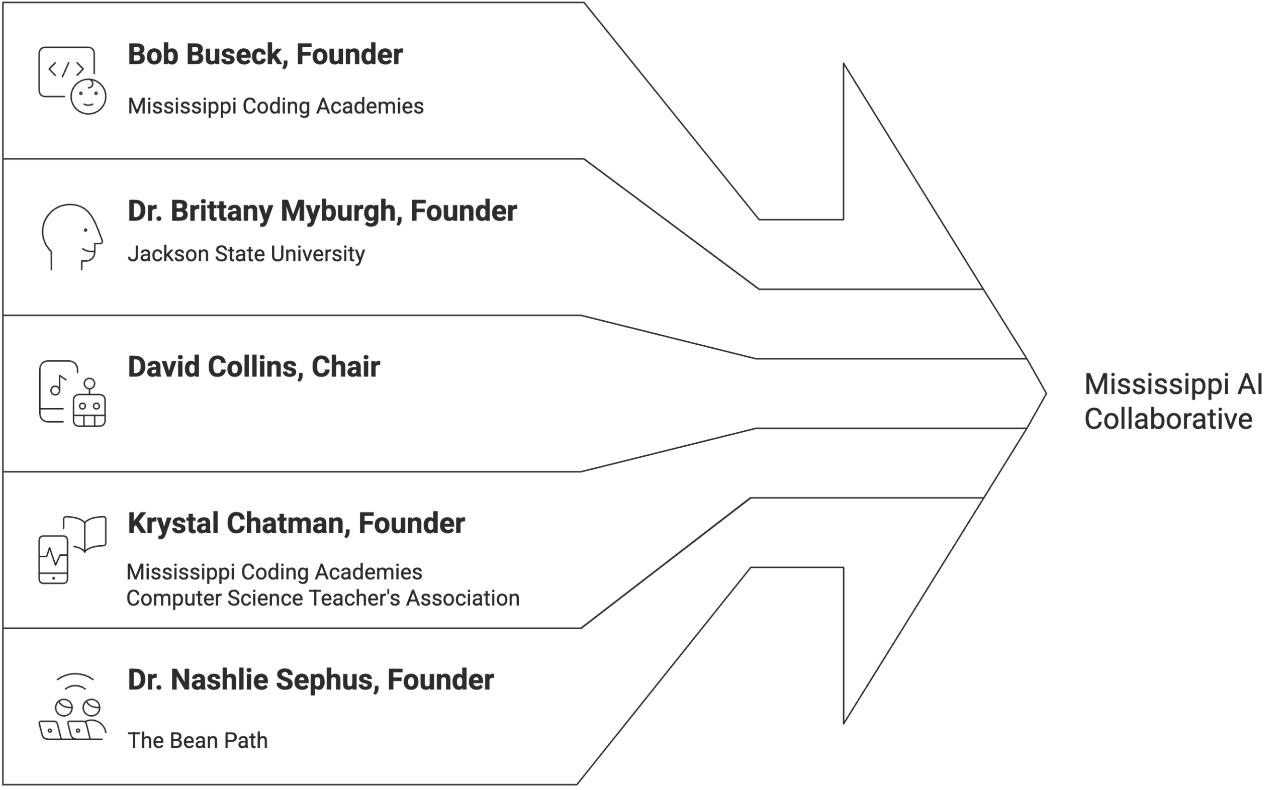 In March 2023, the same four organizations came together to create the foundation of MSAIC: the Computer Science Teachers Association (a curriculum support teachers’ network), Jackson State University, The Bean Path (a tech nonprofit focused on community empowerment), and the Mississippi Coding Academies (an alternate model focused on workforce training). Each brought a different strength, from classrooms and universities to community outreach and workforce training, improving credibility across education, the community, and industry. With support from data.org, they chose to join forces and imagine a future where Mississippi leads in artificial intelligence.