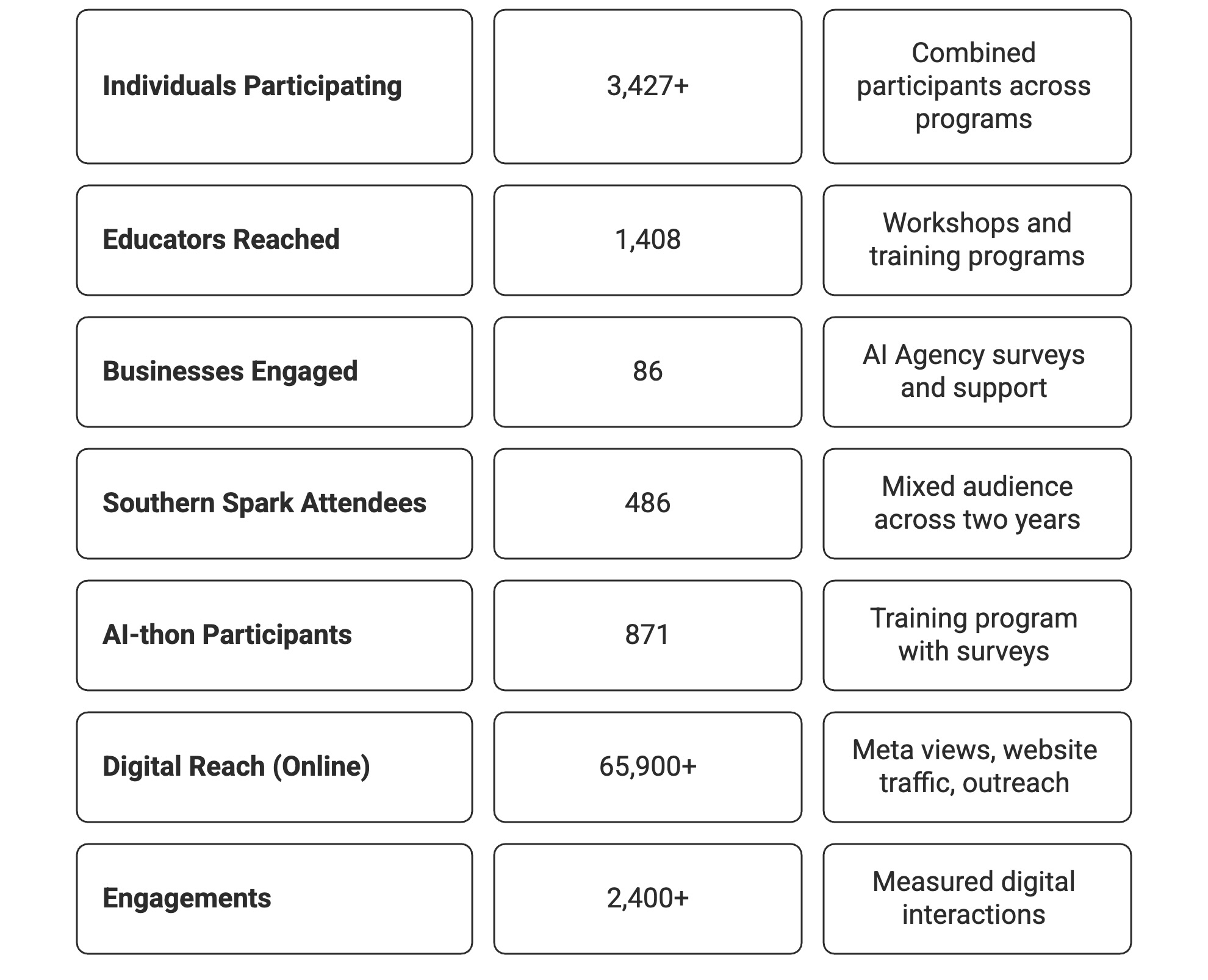 In its first year, MSAIC turned vision into outcomes that can be counted and felt. More than 3,400 people have taken part across programs, over 1,400 educators have been trained, 86 businesses have received support, and online content has reached about 66,000 people. Progress is tracked through sign-ups, pre- and post-surveys, feedback forms, participation records, and digital analytics.