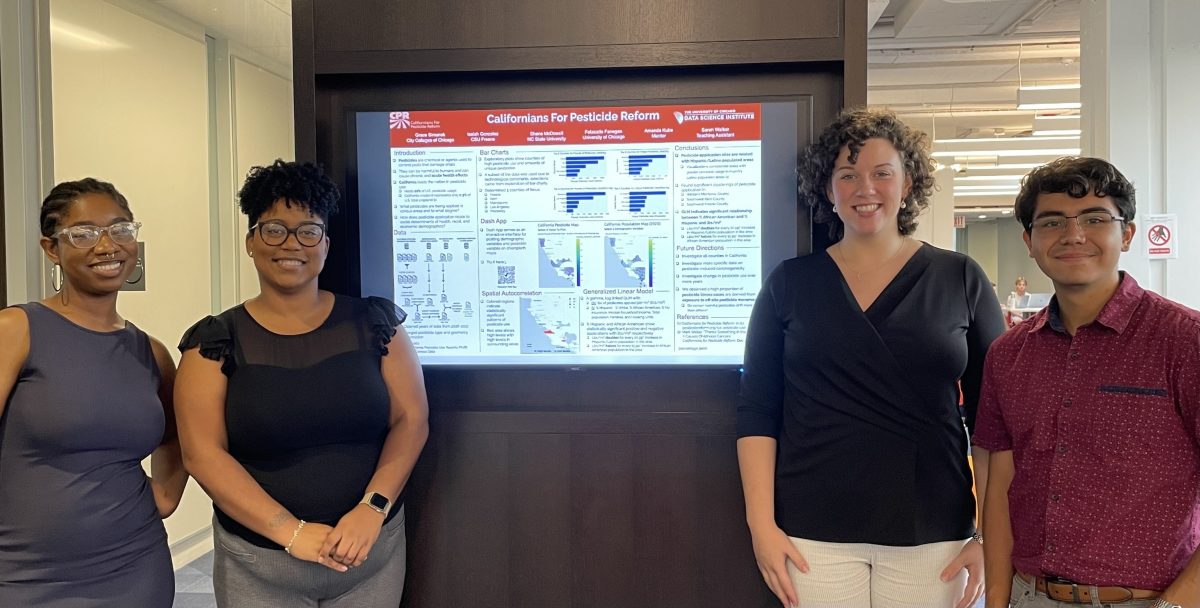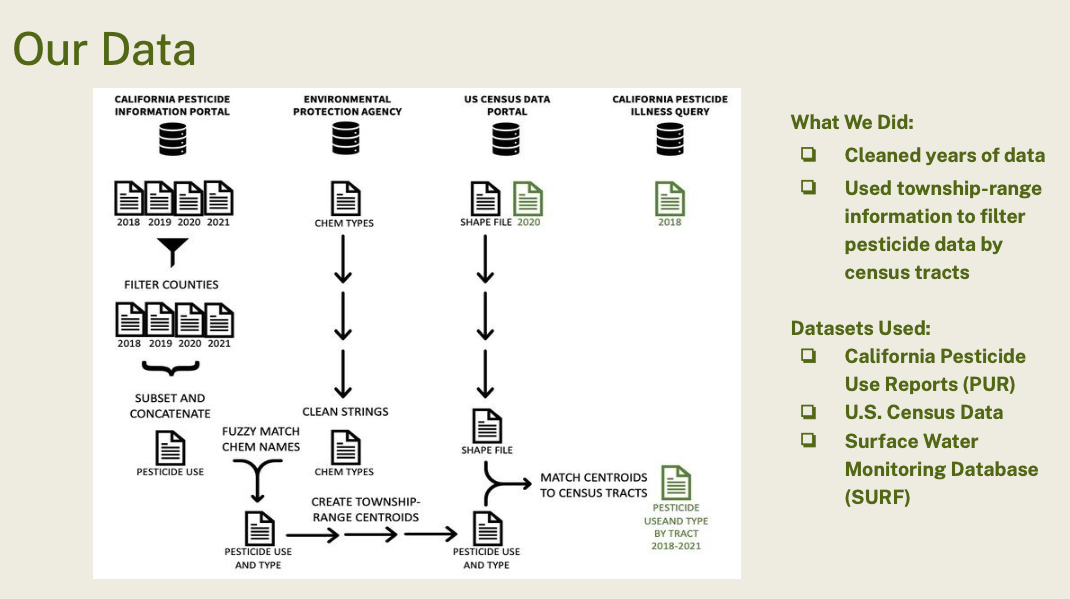 Gonzalez and his peers on his team, Shana McDowell (NC State), Folasade Fanegan (University of Chicago), and Grace Simunek (Harry S Truman College), along with mentors Dr. Amanda Kube Jotte and Sarah Walker, brought together datasets from California Pesticide Use Reports, US Census data, and the Surface Water Monitoring Database. They cleaned years of data and used township-range information to filter pesticide data by census tracts.