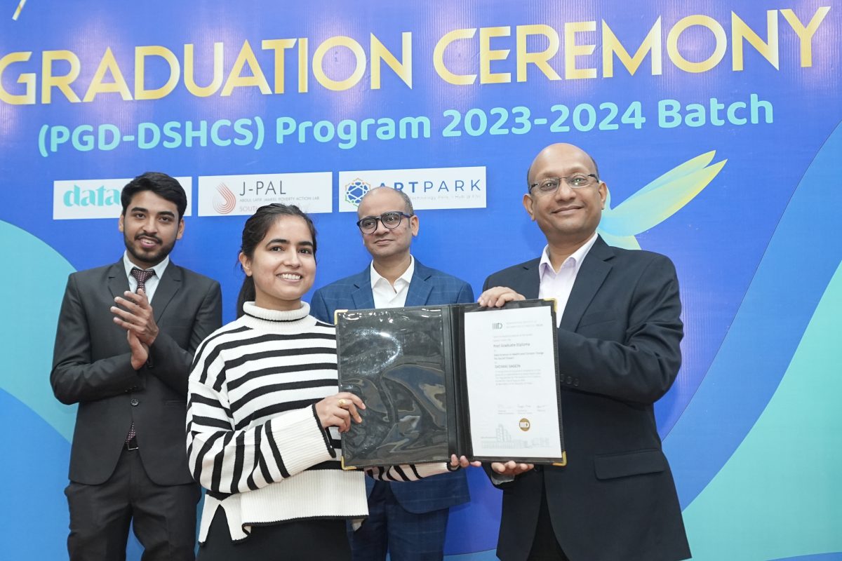 Shivam Shukla, Shivani Gagein, Tikesh Bisen, and Ranjan Bose, at CAN India partner, IIIT Delhi’s graduation ceremony for the Postgraduate Certificate in Data for Social Impact (Climate & Health) program.